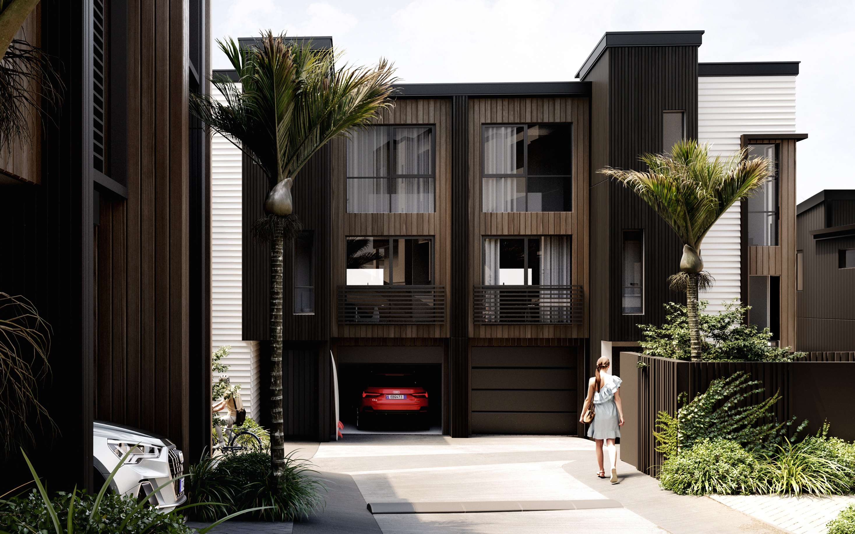 The design emphasises privacy, orientation, and efficient circulation, and also responds to the site’s steep topography by carefully orchestrating the placement and elevation of both dwellings and driveways to optimise access, stability, and spatial quality. This approach creates a cohesive streetscape and a high-quality living environment that balances urban convenience with residential comfort.